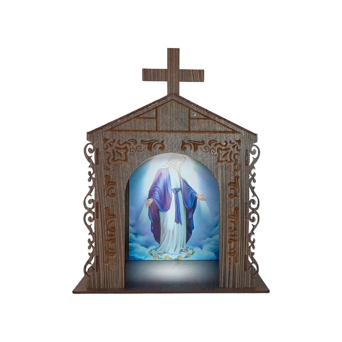 No interior, encontra-se uma imagem que inspira serenidade e devoção, tornando este oratório um local sagrado para contemplação e reflexão. Colocado em qualquer espaço, seja no quarto, na sala de estar ou em um ambiente de meditação, ele se torna um ponto focal de beleza e espiritualidade. Produto Acompanha LED na parte interior realçando o valor do Oratório