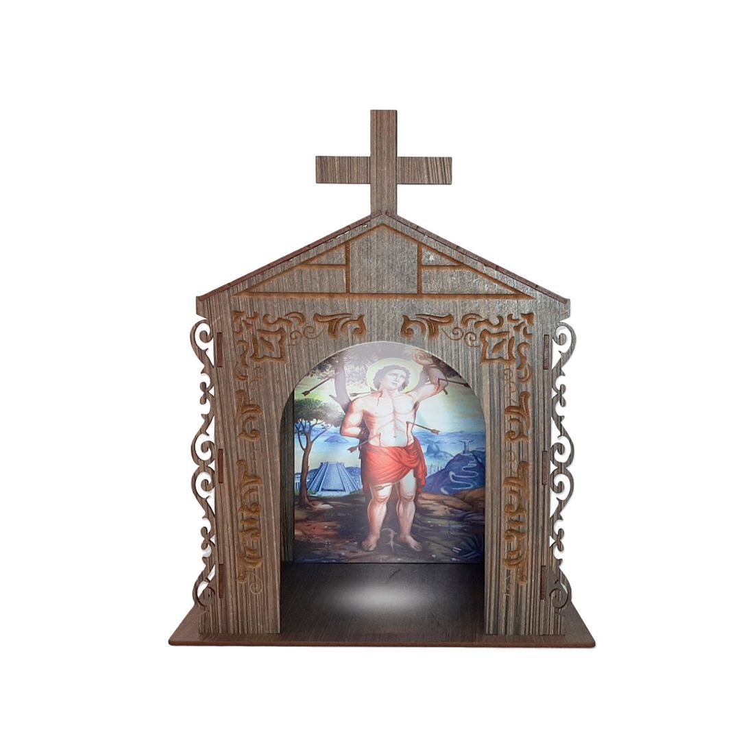 No interior, encontra-se uma imagem que inspira serenidade e devoção, tornando este oratório um local sagrado para contemplação e reflexão. Colocado em qualquer espaço, seja no quarto, na sala de estar ou em um ambiente de meditação, ele se torna um ponto focal de beleza e espiritualidade. Produto Acompanha LED na parte interior realçando o valor do Oratório