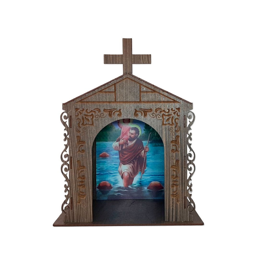 No interior, encontra-se uma imagem que inspira serenidade e devoção, tornando este oratório um local sagrado para contemplação e reflexão. Colocado em qualquer espaço, seja no quarto, na sala de estar ou em um ambiente de meditação, ele se torna um ponto focal de beleza e espiritualidade.