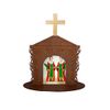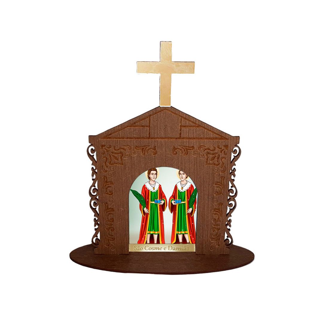 Display Enfeite de Mesa Religioso Capelinha Oratório São Cosme e Damião 20cm Mdf Madeira Imbuia