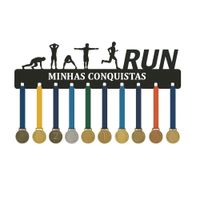Porta Medalhas Run Minhas Conquistas em Mdf Preto Suporte Esportivo de Parede 51cm