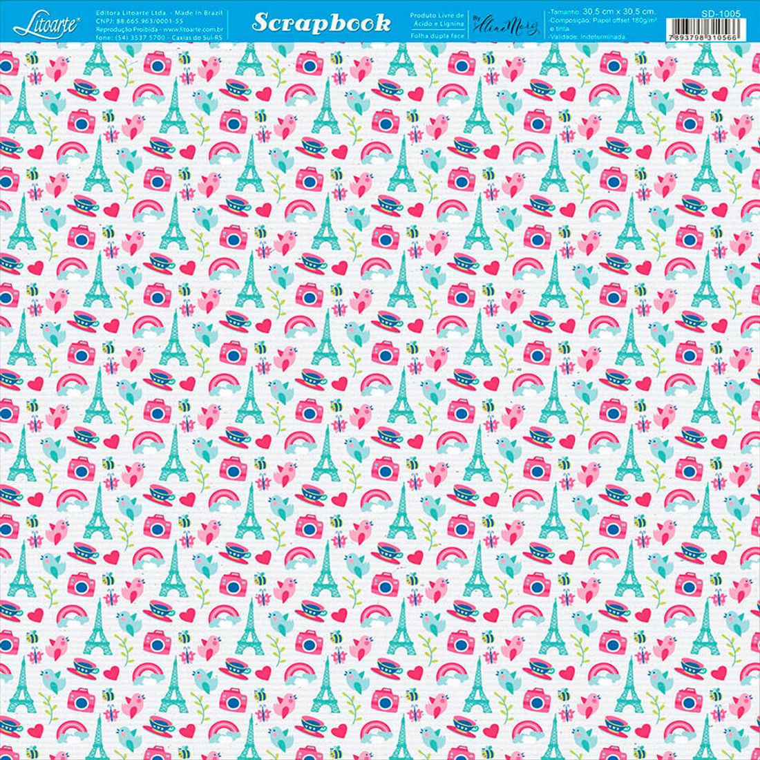 Papel Scrapbook Sd-1005 Dupla Face Amor Paris e Flor 30,5x30,5cm Litoarte